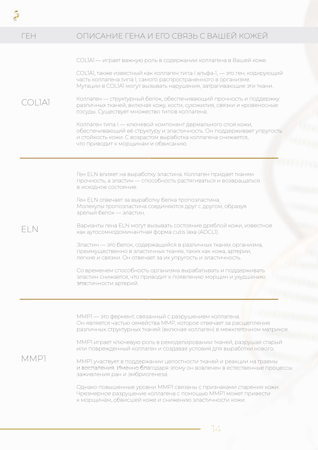 Мы анализируем более 100 генов, чтобы создать персональный генетический паспорт красоты и помочь вам подобрать идеальный уход на основе вашей ДНК. Анализ семи ключевых аспектов здоровья кожи показывает: