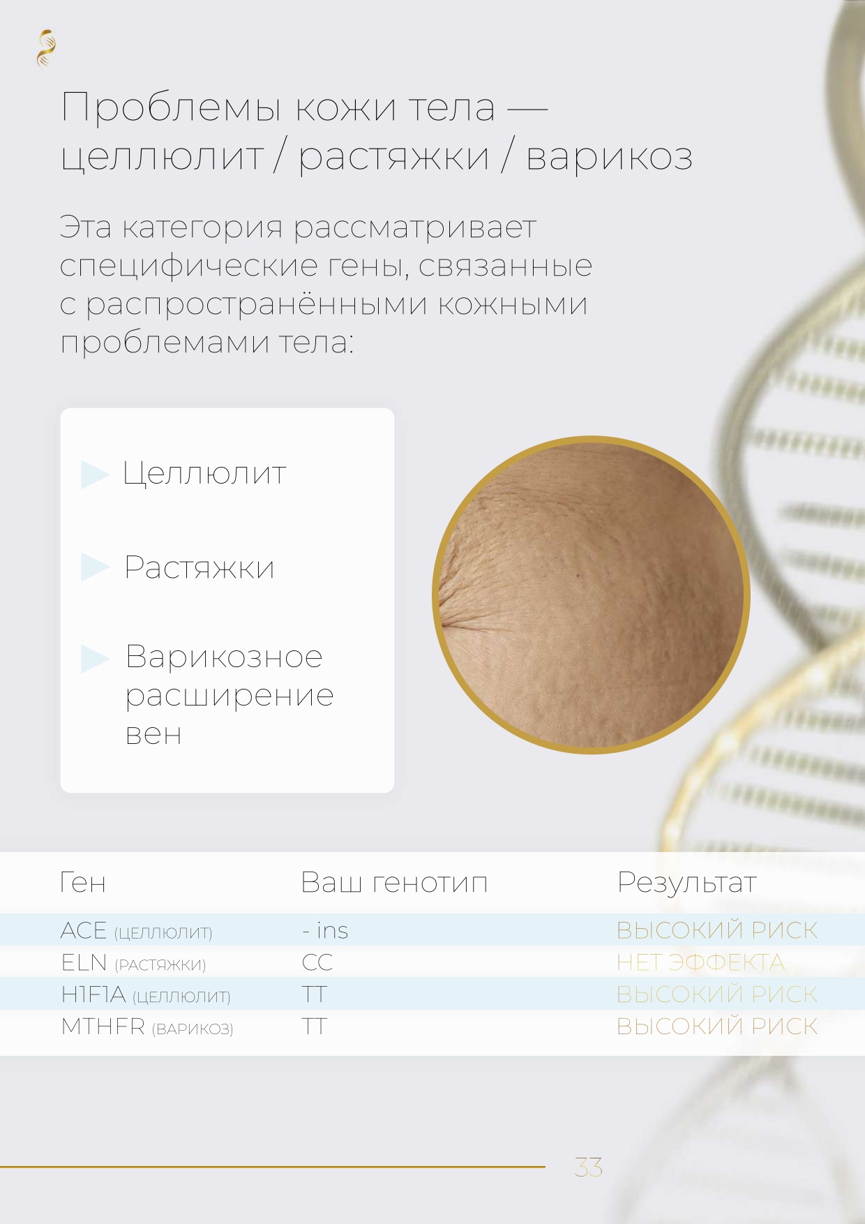 +7 (861) 206-77-65ДНК-тест Skin Care (генетика красоты) помогает понять, как именно ваши гены влияют на состояние кожи и волос. Это не медицинский диагноз, а персонализированный генетический отчёт, который показывает врождённые особенности организма и даёт рекомендации по уходу.